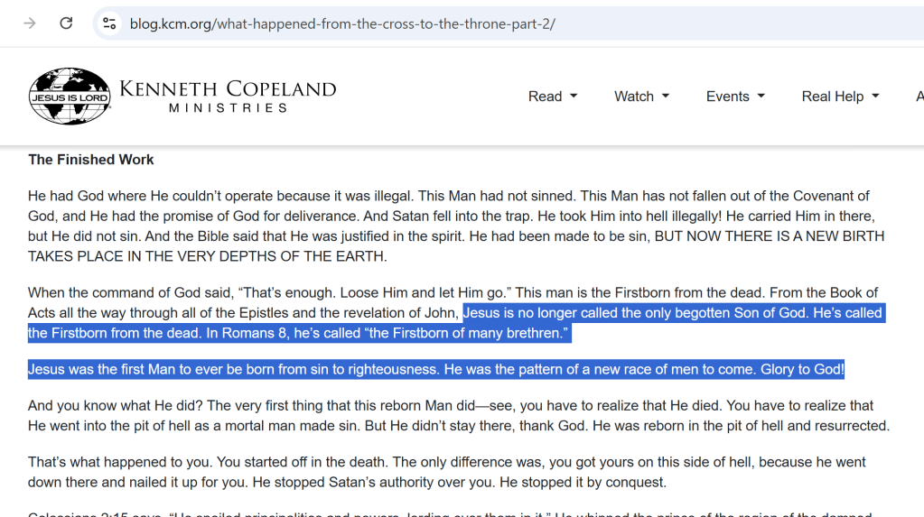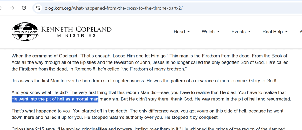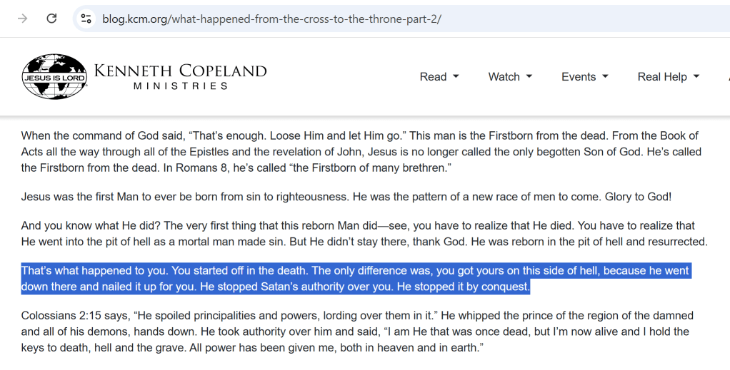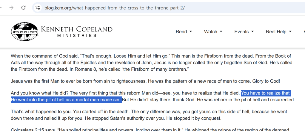 I am writing this article to show plainly that Kenneth Copeland on his website is teaching the idea that Jesus was born again in hell, and the ridiculousness of this idea, and why this idea is a false teaching, and Copeland’s misunderstanding of Jesus’s authority.