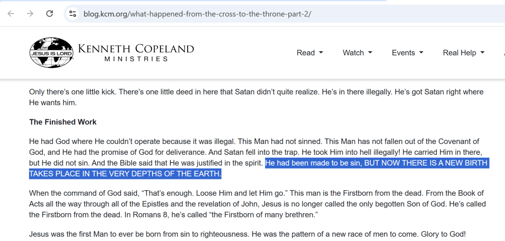 I am basing this blog post on Kenneth Copeland’s online article entitled “What Happened From The Cross To The Throne Part 2” I will share screenshots to document the false teachings in his article. This screenshot below was taken near the heading entitled “The Finished Work”. Note the highlighted areas: