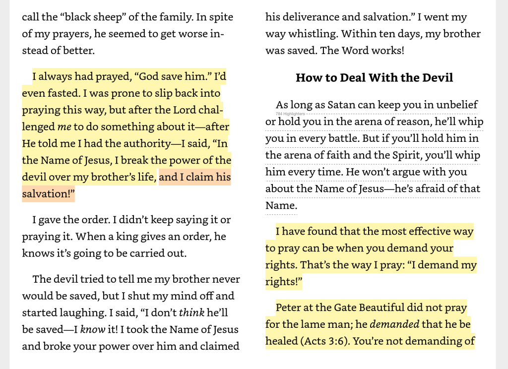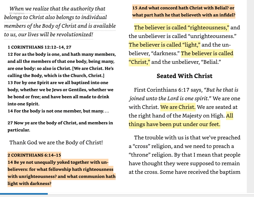 Here’s the screenshot from Hagin’s book, “The Believer’s Authority, Chapter 3, entitled “Seated With Christ” Pay attention to the yellow highlighting: